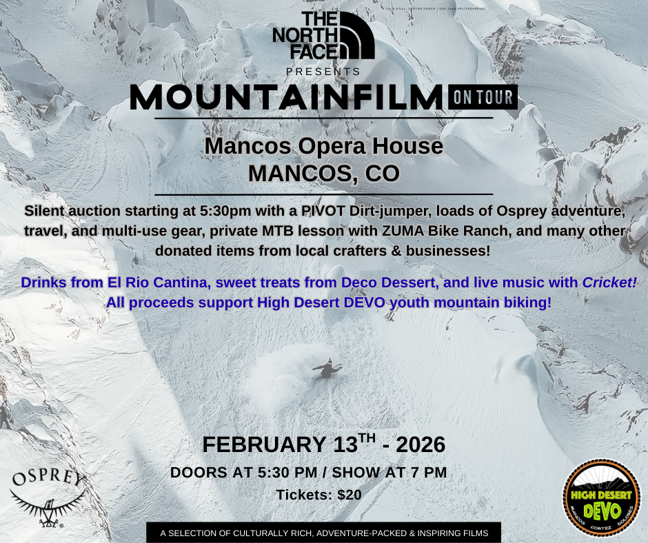 High Desert DEVO, in partnership with Osprey Packs, is hosting Mountainfilm On Tour at the Mancos Opera House on Friday, February 13th starting at 5:30PM. Join us for an evening of inspiring and captivating films handpicked from the Mountainfilm festival in Telluride, Colorado, a silent auction with amazing items (PIVOT Dirt Jumper, LOADS of Osprey casual and adventure gear, private MTB lesson, and more!), drinks from El Rio Cantina, sweet delights from DECO Dessert, and live music with Cricket!!