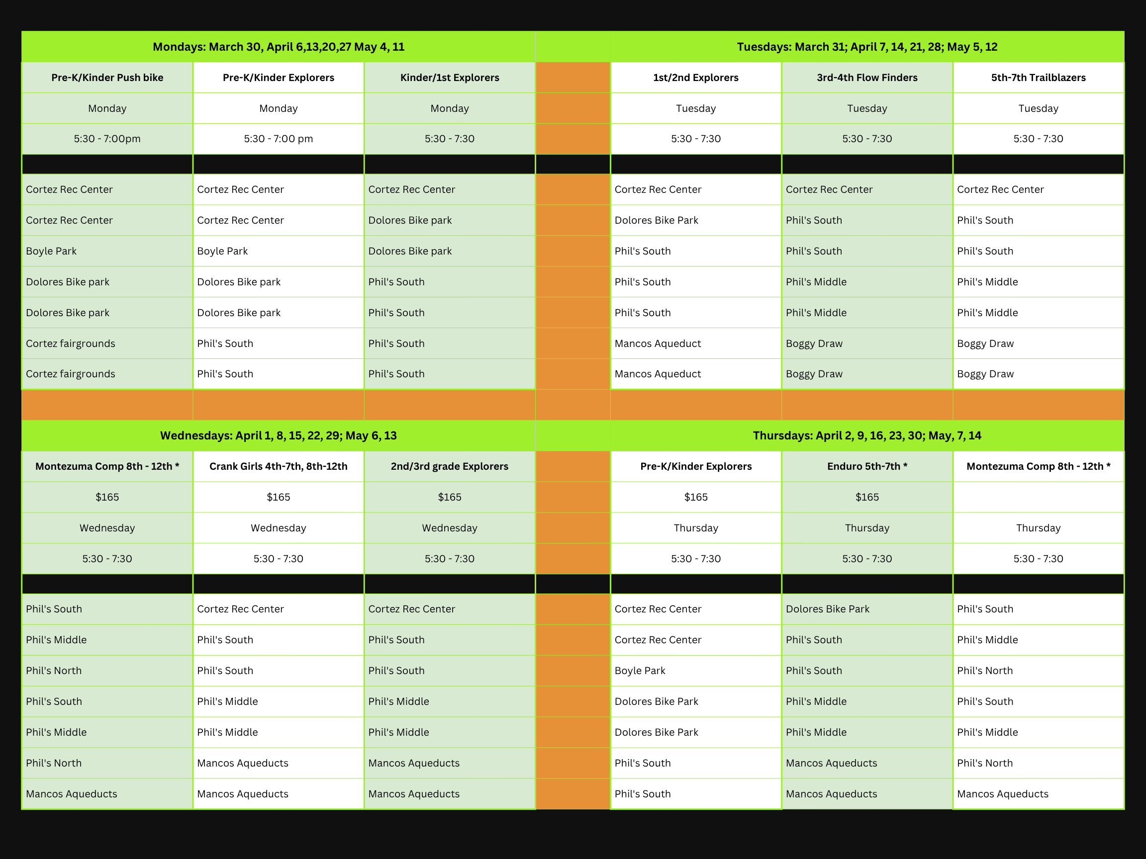 We have a qualified coaching staff to lead group rides - all coaches are High Desert Devo trained and have first aid and concussion training. Many of our coaches volunteer their time at High Desert Devo. Group rides typically meet at Phil's World, Boggy Draw, Dolores Overlook Trail, and other trails local to Dolores, Cortez and Mancos.